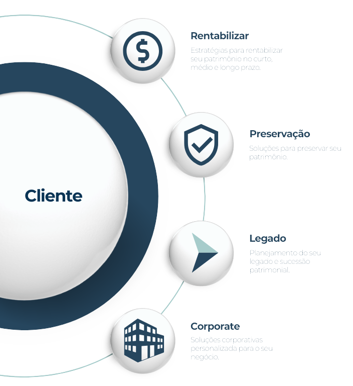 Com atenção total às suas necessidades, desenvolvemos estratégias personalizadas que impulsionam sua rentabilidade, protegem seu patrimônio e proporcionam um legado sólido.